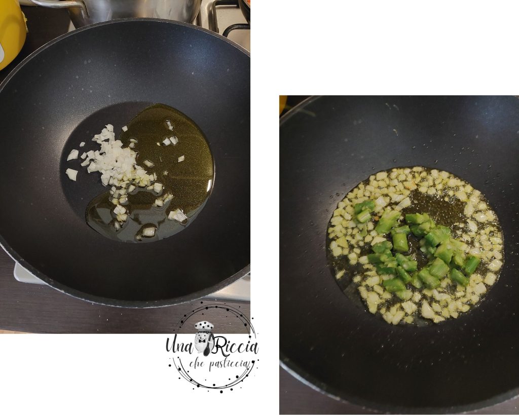 Nettoyons les asperges en enlevant la partie finale la plus dure, puis lavons-les soigneusement sous l’eau courante. Ensuite, mettons beaucoup d’eau à bouillir dans une casserole et immergeons les asperges. Quand elles seront tendres, mais pas trop, égouttons-les sans jeter l’eau de cuisson. Pendant que les asperges cuisent, éminçons l’oignon.