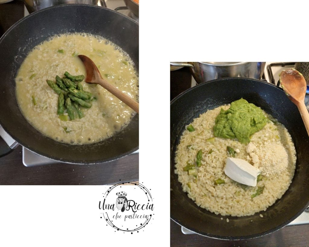 Quand il reste quelques minutes avant la fin de la cuisson du riz, ajoutons les pointes d’asperges et continuons à cuire avec notre eau de cuisson. Goûtons et ajustons le sel et le poivre. Quand il sera prêt, éteignons le feu et ajoutons la crème d’asperges mixées et le mascarpone, puis mélangeons pour tout amalgamer.