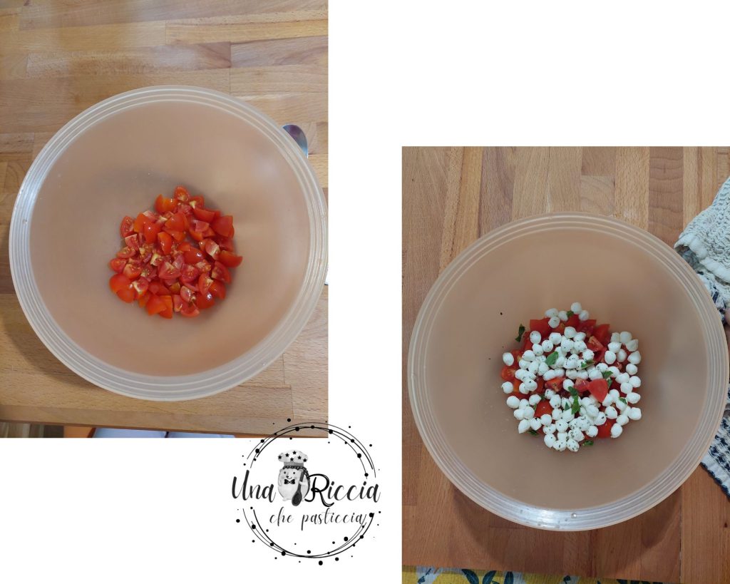 Dans la casserole, mettons l’eau à bouillir pour cuire les céréales, pendant ce temps, lavons les tomates cerises et coupons-les en 4 parties (si elles sont trop grandes, en 8) et mettons-les dans un saladier. Si vous avez des petites boules de mozzarella, ajoutez-les aux tomates, sinon, si vous avez des petites boules de mozzarella cerise ou de la grande mozzarella, coupez-la en dés et ajoutez-les aux tomates cerises. Ajoutez également les feuilles de basilic déchirées à la main et une pincée d’origan.