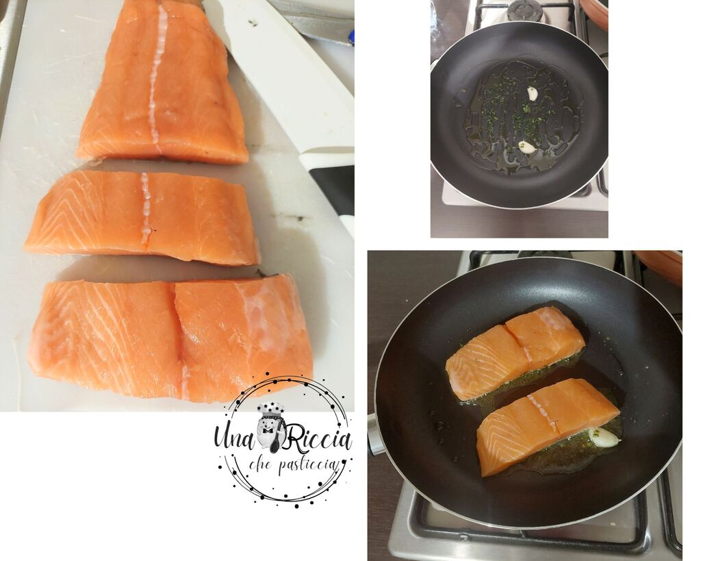 Prenons le filet de saumon et coupons-le en morceaux plus petits d’environ 200 grammes. Dans une poêle antiadhésive, mettons l’huile d’olive, une gousse d’ail pelée et coupée en deux et du persil frais finement haché. Laissons chauffer légèrement puis déposons les filets de saumon et laissons cuire 30 secondes à feu vif.