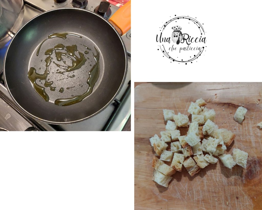 Entre-temps, préparons des croûtons de pain à poser sur notre soupe pour avoir la partie croquante du plat. Prenons 3-4 tranches de pain et coupons-les en dés. Dans une poêle antiadhésive, versons un filet d’huile, faisons chauffer et ajoutons les dés de pain. Remuons de temps en temps et laissons cuire jusqu’à ce qu’ils soient bien dorés de tous côtés. Si vous le souhaitez, vous pouvez également les cuire au four ou dans une friteuse à air.