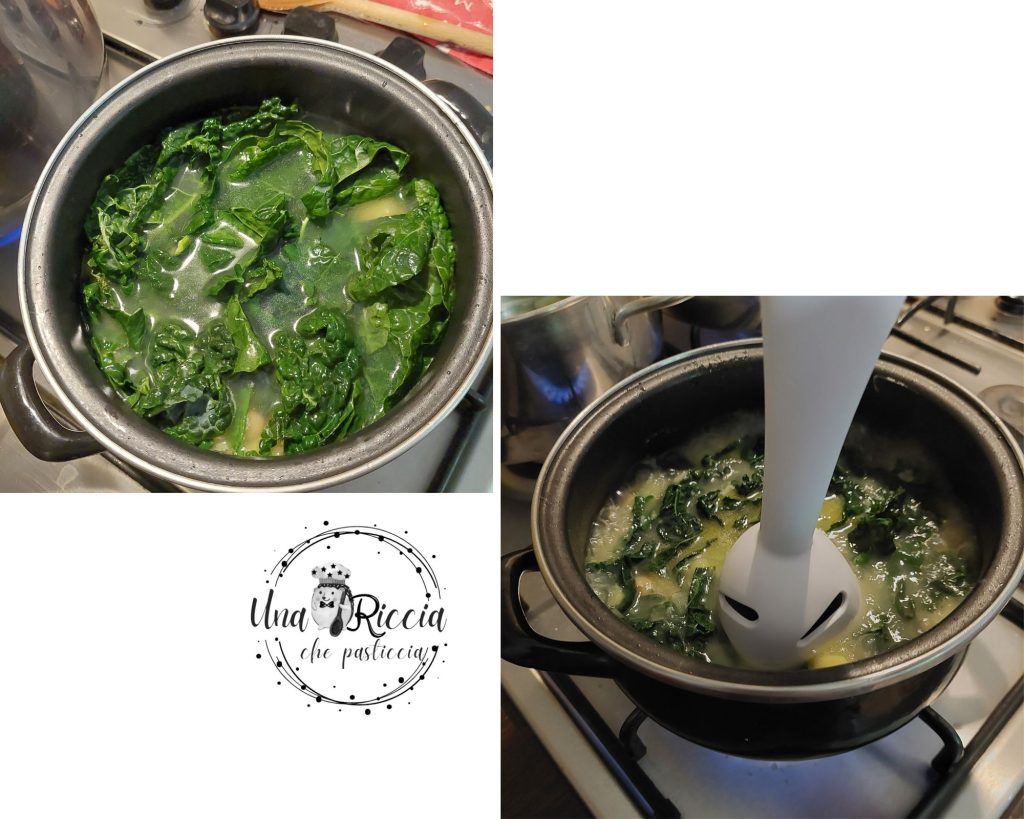 Ajoutons aux pommes de terre et aux pois chiches les feuilles de chou noir égouttées, mélangeons et ajoutons plus de bouillon puis continuons la cuisson en ajoutant du bouillon et en remuant de temps en temps. Laissons cuire pendant dix minutes puis, avec un mixeur plongeant, mixons une partie de la soupe et continuons la cuisson pendant encore cinq à six minutes. Goûtons et ajustons le sel et le poivre si nécessaire.
