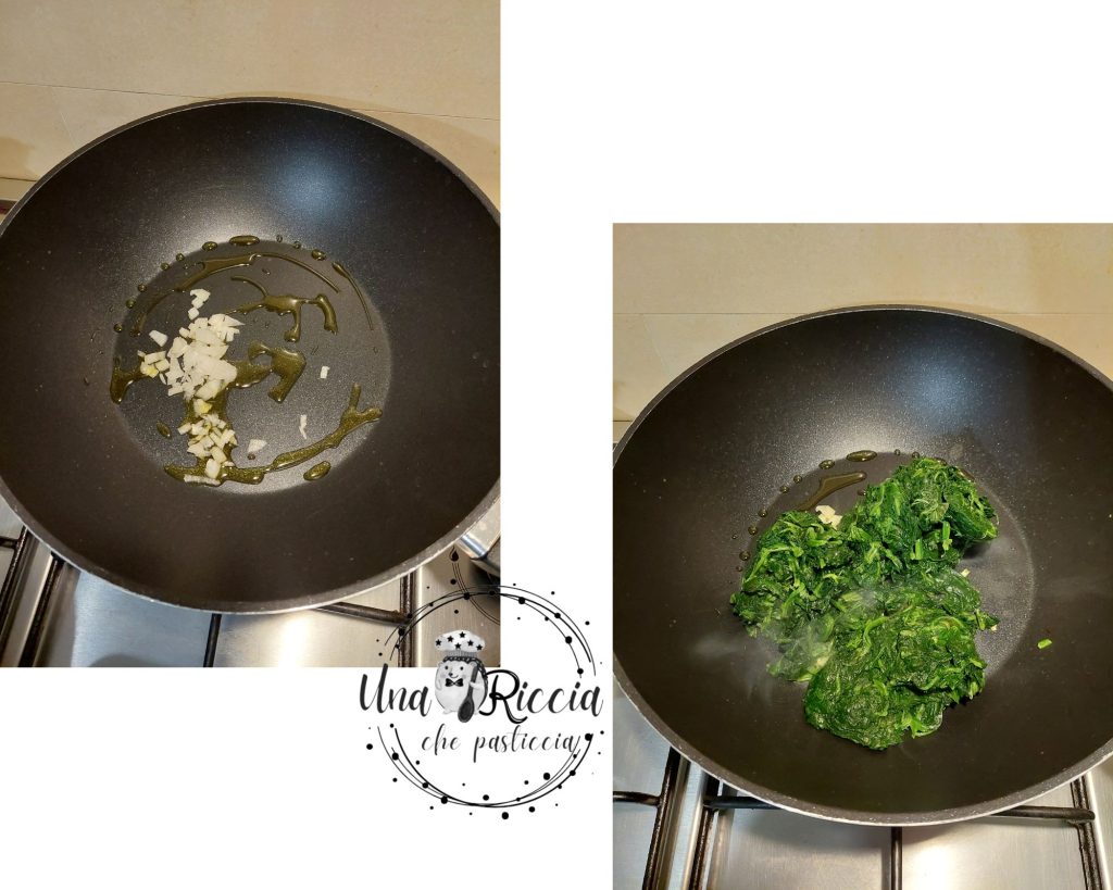 Pendant que la pâte repose, occupons-nous de la garniture. Dans une poêle antiadhésive, mettez un filet d’huile et la demi-oignon finement hachée, laissez chauffer légèrement et ajoutez les épinards cuits (ceux surgelés conviennent aussi) bien égouttés. Faites revenir les légumes dans la poêle pour les aromatiser.