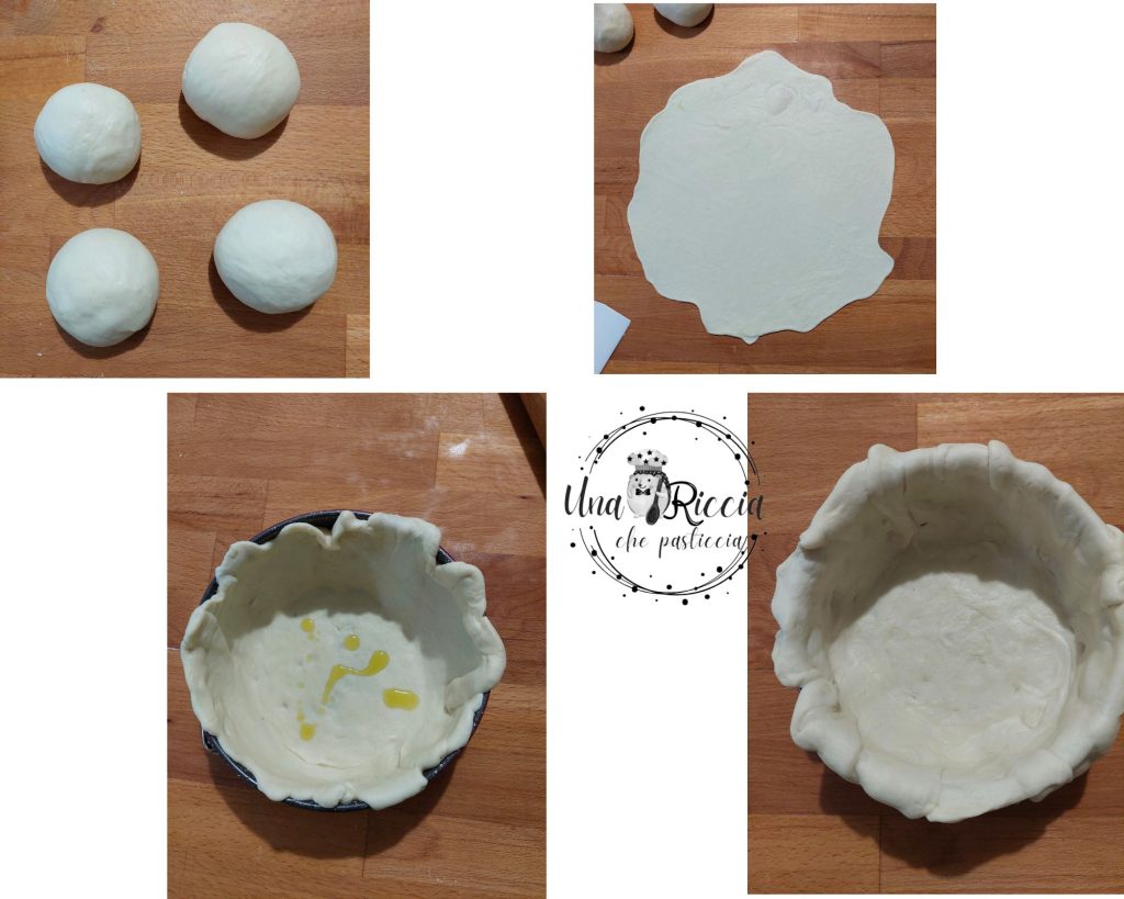 Reprenez la pâte après le temps de repos et divisez-la en quatre parts égales. Étalez une boule aussi finement que possible, prenez le moule de 24 cm et graissez-le légèrement avec de l’huile, puis recouvrez-le avec la pâte étalée. Mettez de côté et étalez une autre boule de pâte aussi finement que possible, badigeonnez avec de l’huile d’olive le premier cercle de pâte et placez le second par-dessus en appuyant bien.