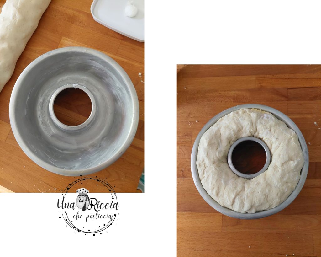 Prenez un moule à savarin de 22/24 cm et graissez-le bien avec du saindoux, puis prenez le tortano et insérez-le dans le moule. Graissez également la surface du tortano avec du saindoux et laissez lever pendant une heure ou deux dans le four éteint. Une fois levé, faites cuire dans un four préchauffé à une température de 180 degrés pendant 60 minutes. Après 50 minutes, vérifiez que la partie supérieure ne devient pas trop colorée, si c’est le cas, couvrez-la d’une feuille de papier aluminium et poursuivez la cuisson.