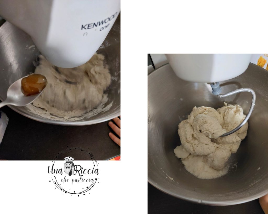 Tout en continuant à pétrir, ajoutez également le miel et, une fois absorbé, incorporez le pecorino râpé et laissez pétrir une minute de plus avec le crochet à vitesse moyenne.