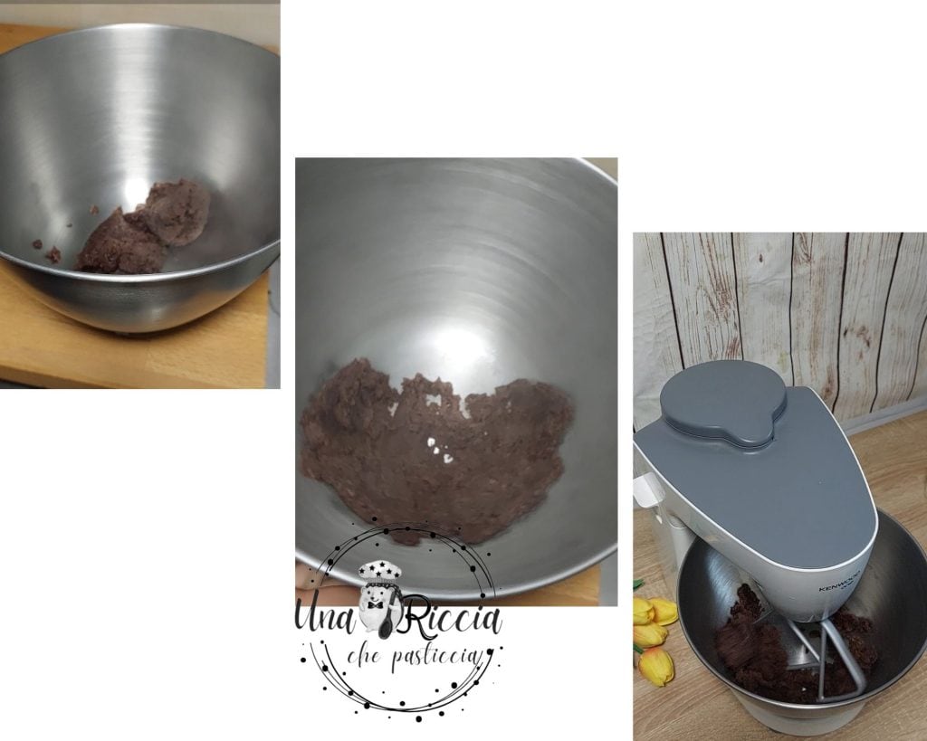 Dans une casserole antiadhésive, mettez l’eau, le beurre et une pincée de sel, allumez le feu et quand le beurre est fondu et que des bulles commencent à se former, baissez légèrement le feu puis ajoutez la farine et le cacao en une seule fois. Mélangez avec une cuillère en bois et laissez cuire, en continuant de mélanger, jusqu’à ce qu’un film brun apparaisse au fond de la casserole.