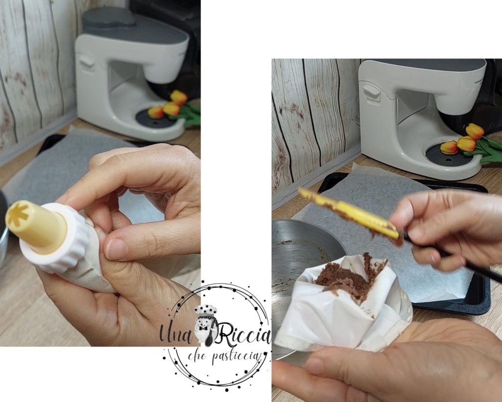 Transférez la pâte obtenue dans une poche à douille avec une buse étoile de 1 cm. Prenez une feuille de papier sulfurisé et dessinez six cercles de 6/7 cm de diamètre puis retournez la feuille et placez-la sur la plaque pour ne pas avoir le dessin en contact.