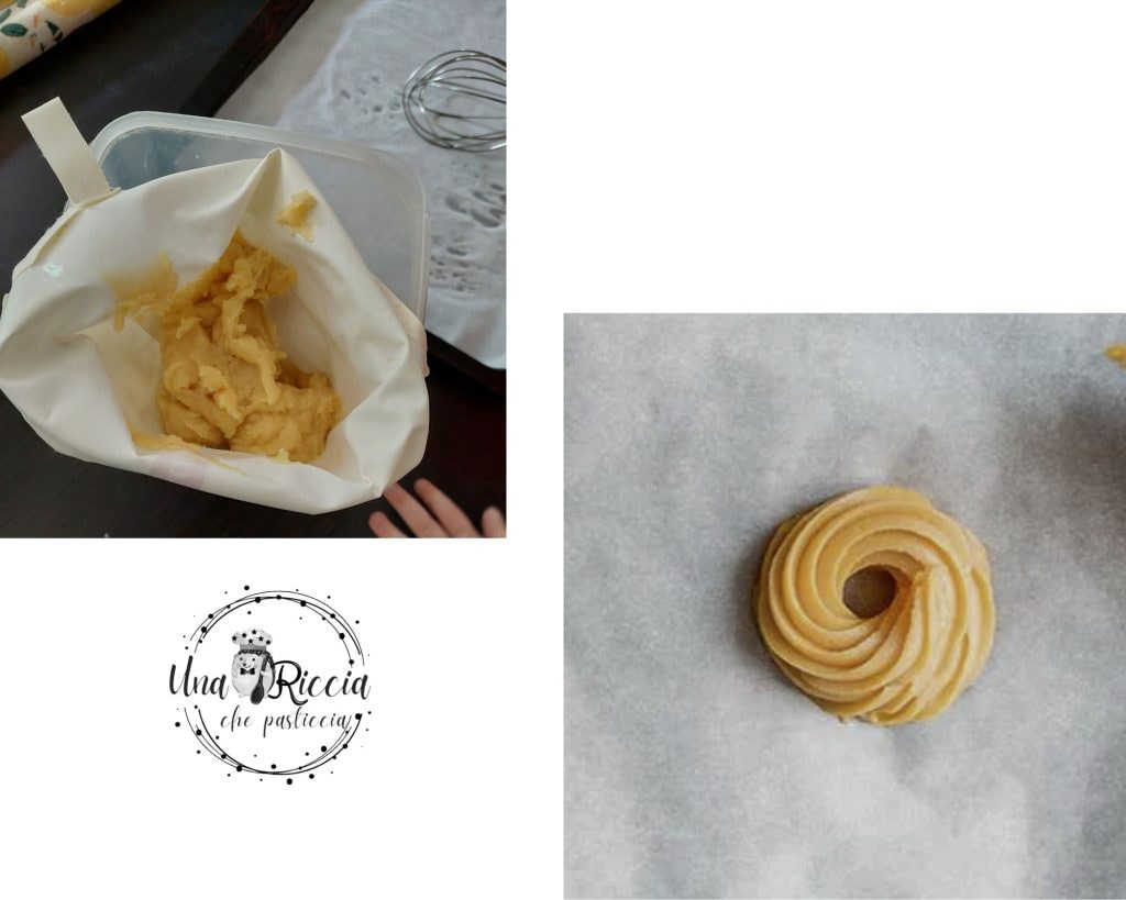 Placez la pâte à zeppole dans une poche à douille avec une douille étoile d’au moins 1 cm. Formez des petits anneaux en suivant le dessin que nous avons fait, faites un premier tour de pâte en suivant la circonférence dessinée et en appuyant beaucoup sur la poche à douille, puis un deuxième tour, en appuyant moins, en le disposant sur le premier mais plus à l’intérieur pour laisser un trou.