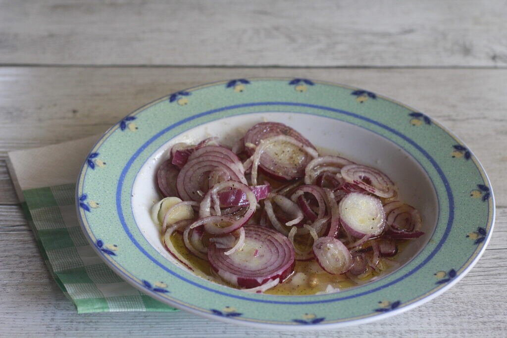 • Assaisonnez les oignons avec le sel, le jus de citron, l’huile et une bonne dose de poivre noir fraîchement moulu