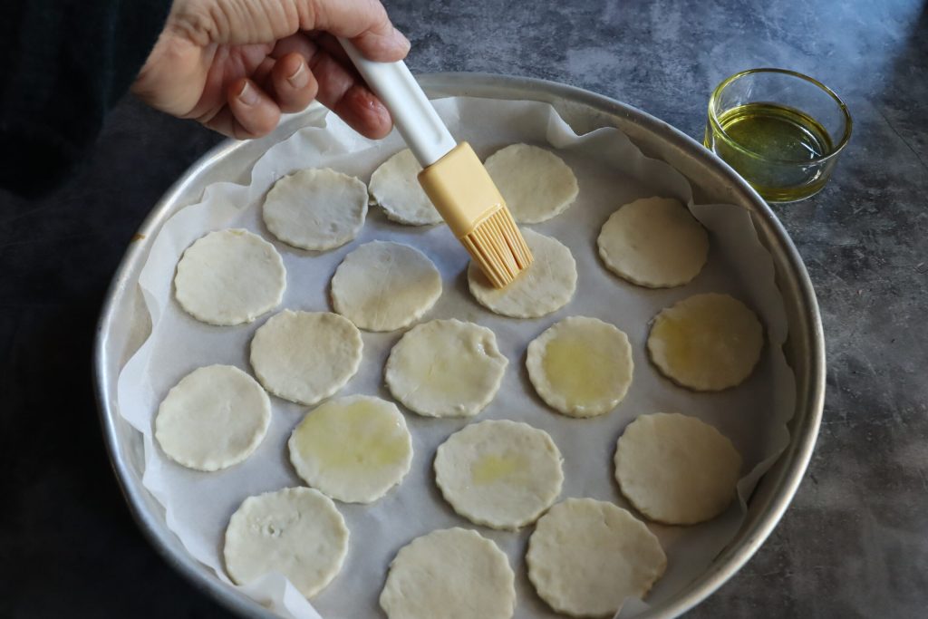 Avec l’emporte-pièce dentelé, j’ai découpé les disques de la pâte feuilletée et, avec le pinceau, je les ai badigeonnés d’huile d’olive extra vierge.