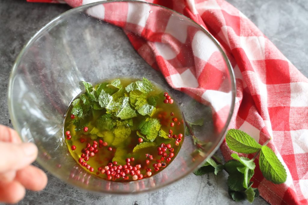 Dans un bol, je mets le poivre rose avec le sel et la menthe romaine lavée et essuyée.