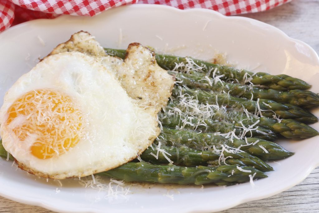 Asperges avec œufs à la Bismark, plus de protéines pour une alimentation renforcée et nourrissante. D’abord, je voudrais expliquer ce qu’est la Bismark : c’est un type de préparation avec des légumes ou avec de la viande et elle prévoit aussi l’œuf cuit au plat par-dessus. Ce plat si robuste porte le nom du chancelier allemand Bismark, un homme très costaud qui aimait beaucoup manger des plats bien consistants et robustes comme lui ; il soutenait aussi que ceux qui travaillaient beaucoup devaient se nourrir plus que correctement. Il est donc facile d’imaginer que le plat tient son nom de là. Sans l’ombre d’un doute, ma préférence va au binôme légumes et œuf frit que je considère comme un second plat complet avec des œufs et des asperges. Et voici donc aujourd’hui mon plat d’asperges avec des œufs à la Bismark.