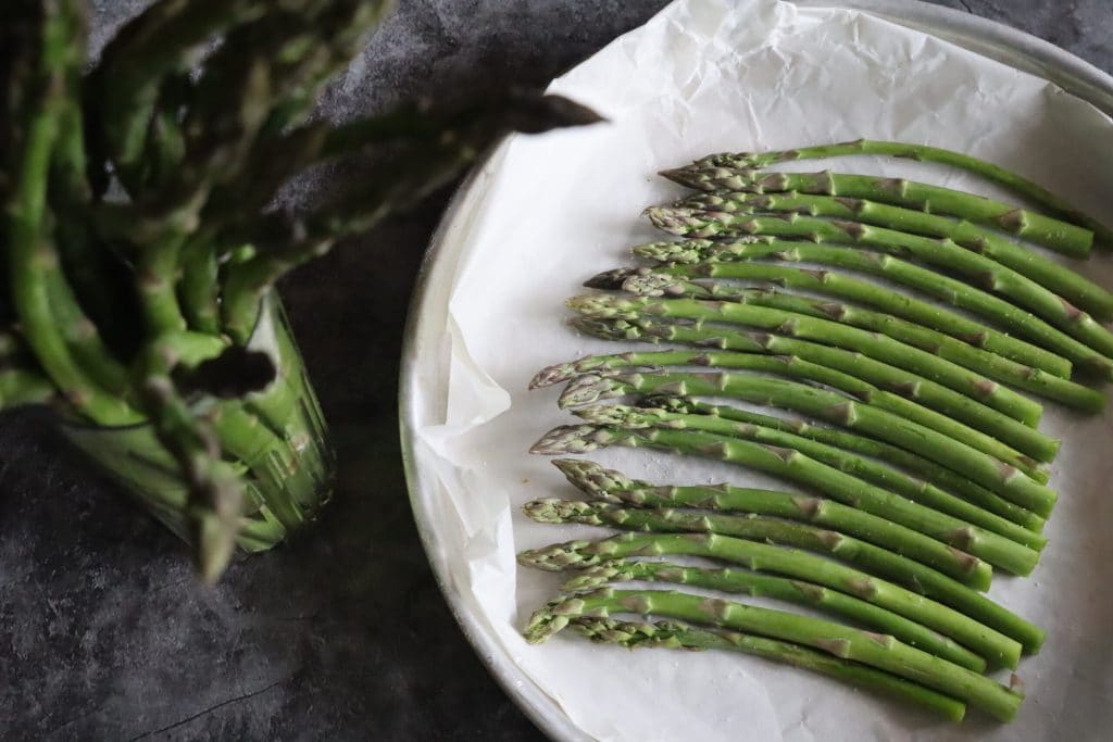 Dans un plat avec du papier cuisson, disposez les asperges en rangée et assaisonnez d’un filet d’huile d’olive vierge extra.