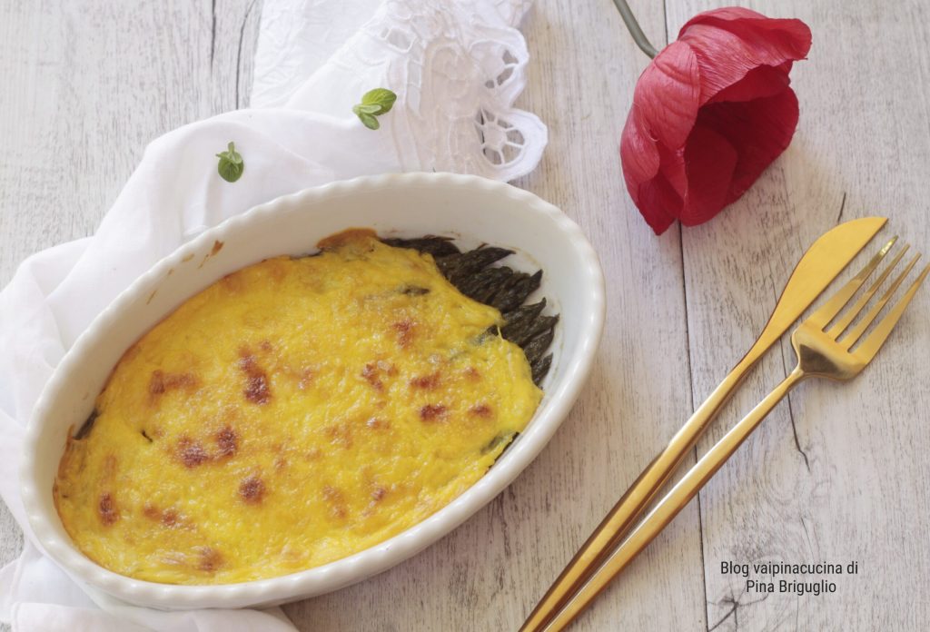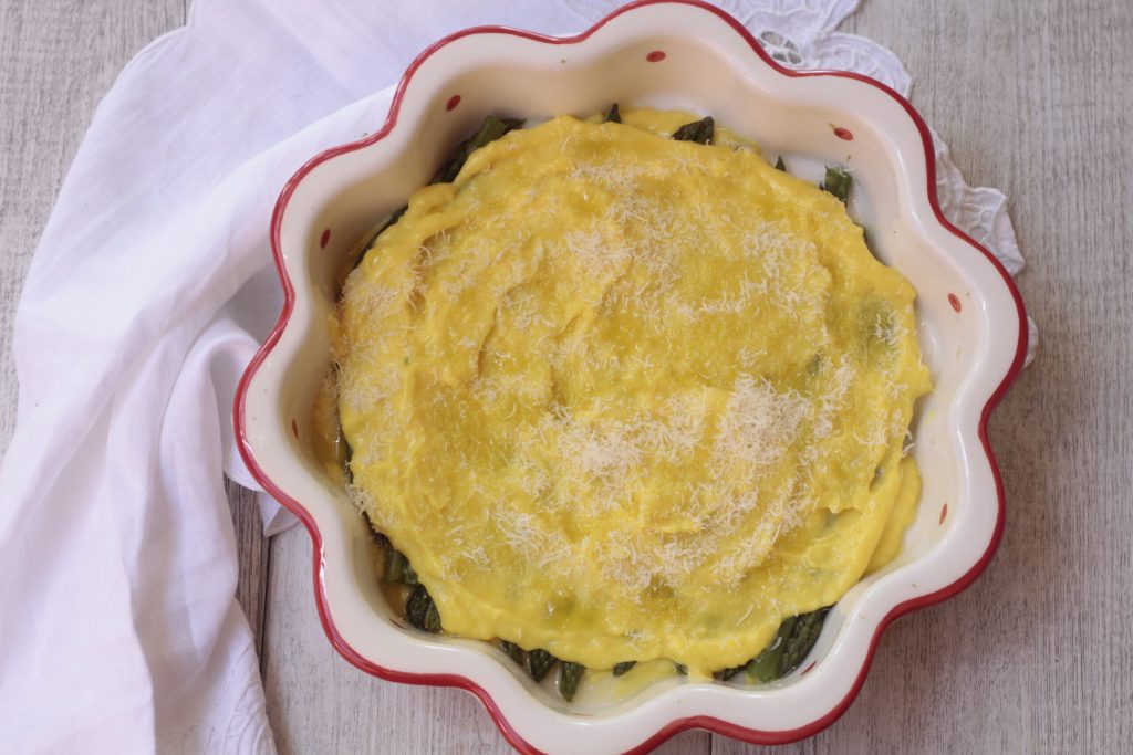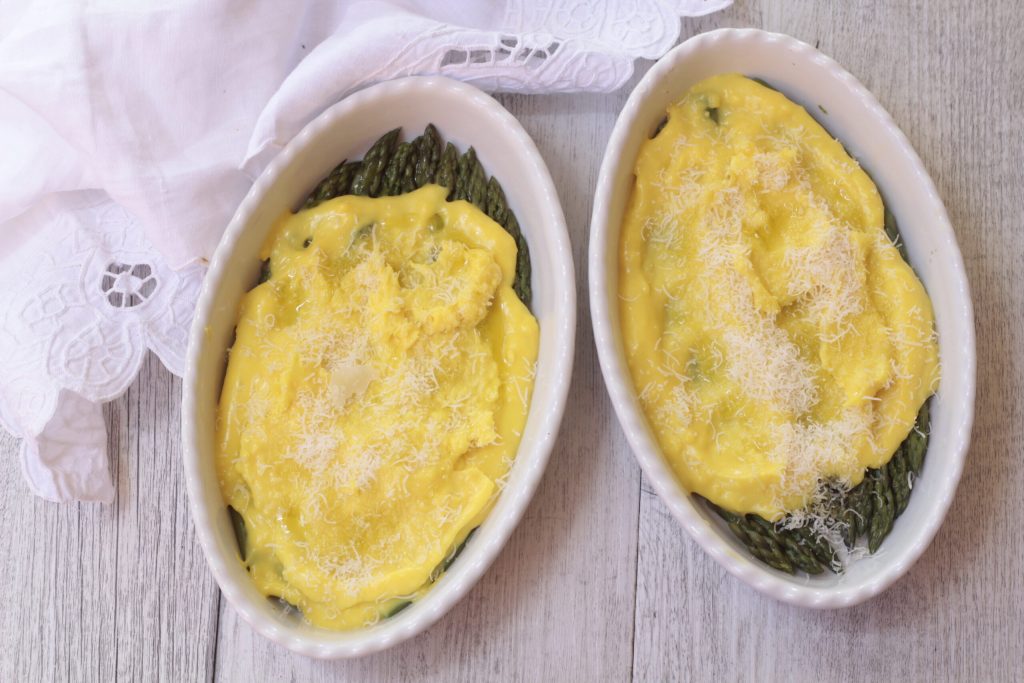 • Ceci est la version en une seule solution dans un plat à gratin, saupoudrez de deux cuillères à soupe de béchamel et placez les asperges déjà blanchies pendant 10 minutes dessus.