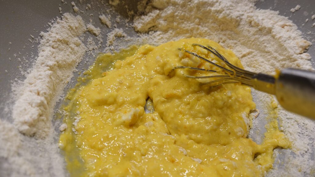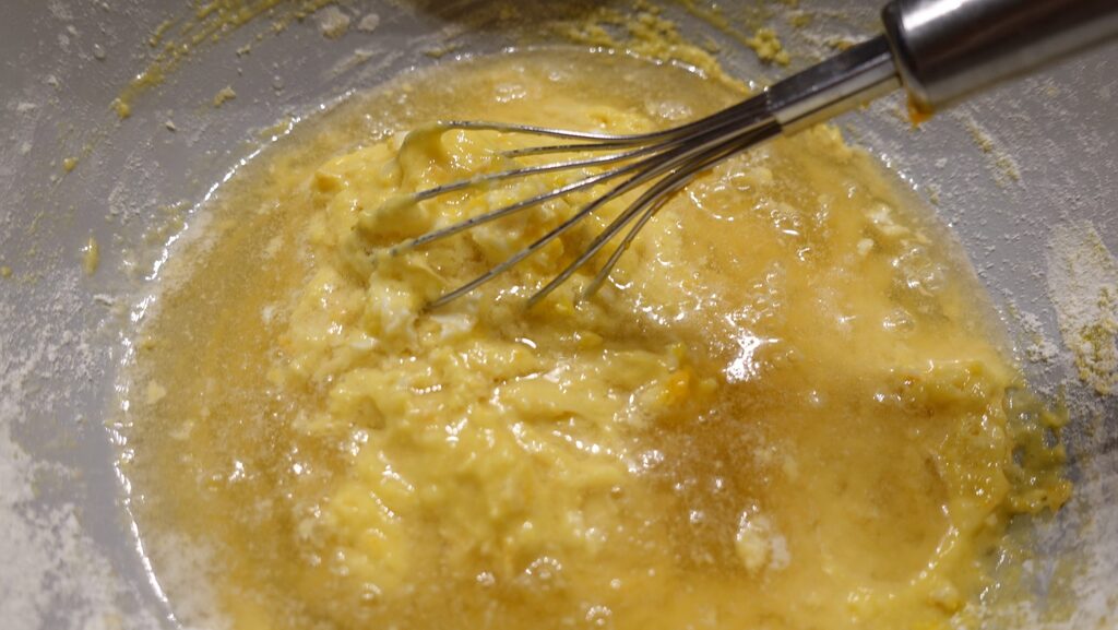 Mélangez la farine avec le sucre, la levure et les œufs, avec un fouet, pas forcément électrique, fouettez énergiquement. Ajoutez aussi une pincée de sel et le beurre.