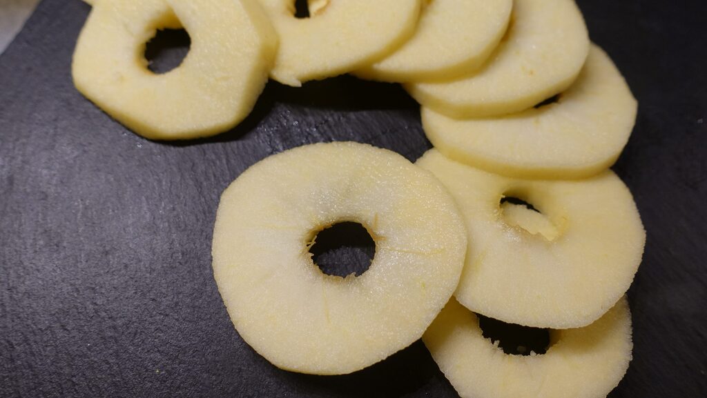 Épluchez les pommes et enlevez le trognon avec l’outil approprié. Coupez-les en tranches pas trop fines. Un centimètre peut convenir.