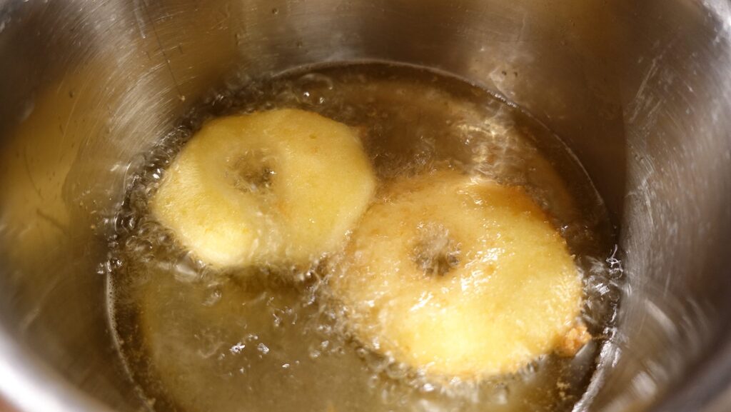 Faites frire les beignets aux pommes dans l’huile abondante en les retournant souvent, jusqu’à ce qu’ils prennent une belle couleur ambrée.
