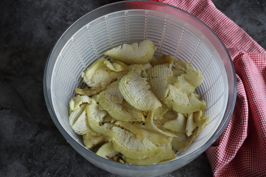 • Utilisez l’essoreuse pour sécher la salade et mettez les aubergines tranchées à égoutter légèrement après les avoir saupoudrées d’une fine couche de sel.