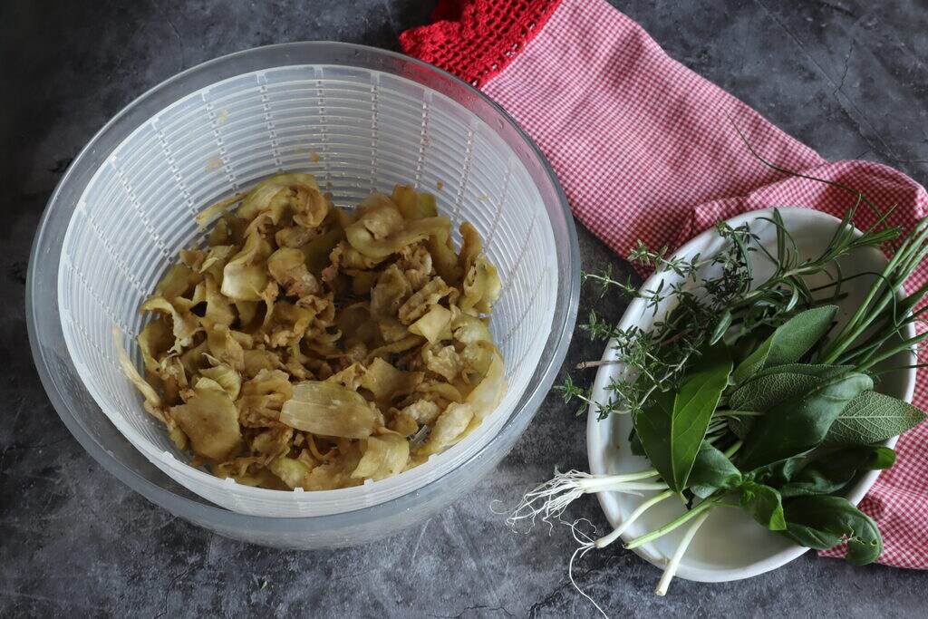 • Utilisez l’essoreuse pour sécher la salade et mettez les aubergines tranchées à égoutter légèrement après les avoir saupoudrées d’une fine couche de sel.