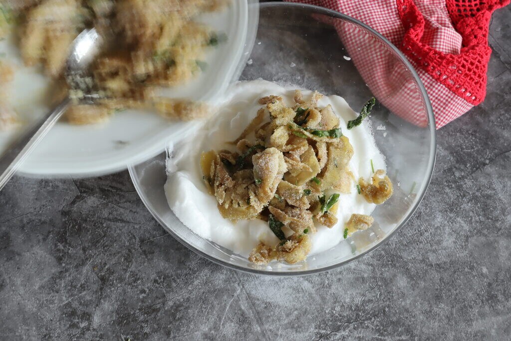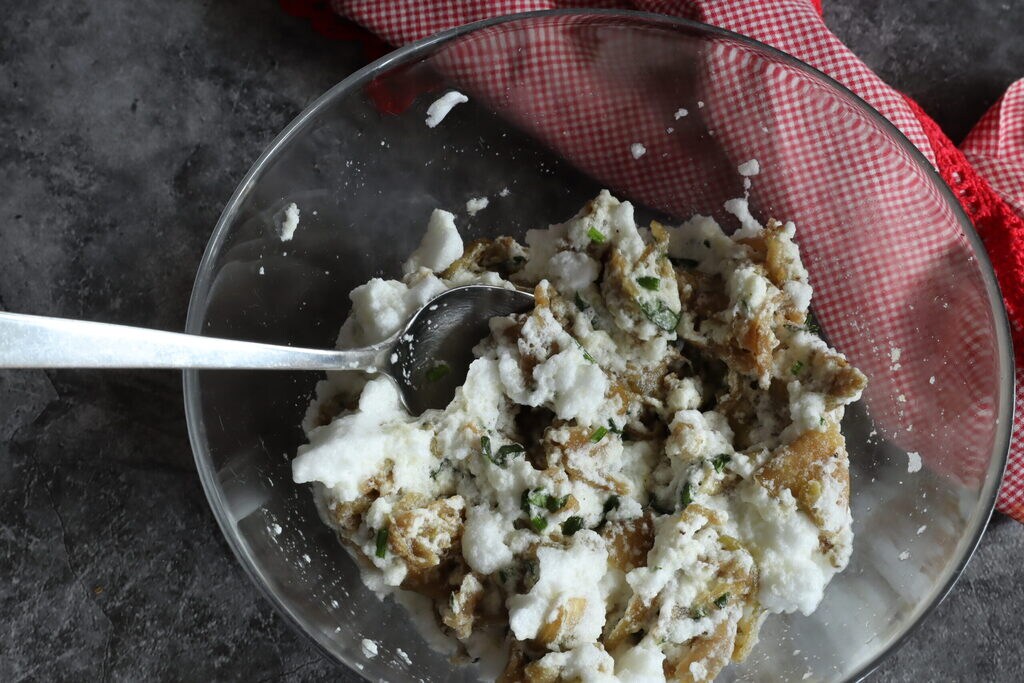 • Après avoir lavé et haché toutes les herbes, mélangez-les avec les aubergines pressées.