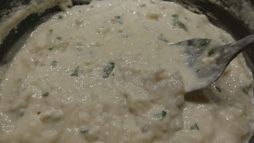 Hachez la chair de cabillaud, assaisonnez-la avec de l’ail et du persil également hachés. Mélangez la farine avec la levure, ajoutez l’eau et à l’aide du fouet, mélangez bien. Assurez-vous bien entendu qu’il ne se forme pas de grumeaux.
