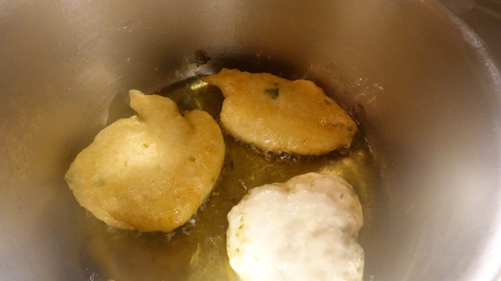 Entre-temps, chauffez l’huile d’olive extra vierge et faites frire des cuillerées de pâte de cabillaud. Une idée supplémentaire pourrait être d’utiliser de la levure de boulanger à la place de la levure sèche, la seule variante étant qu’il faudra laisser reposer la pâte de cabillaud pendant trente minutes, le frit sera sûrement plus gonflé.