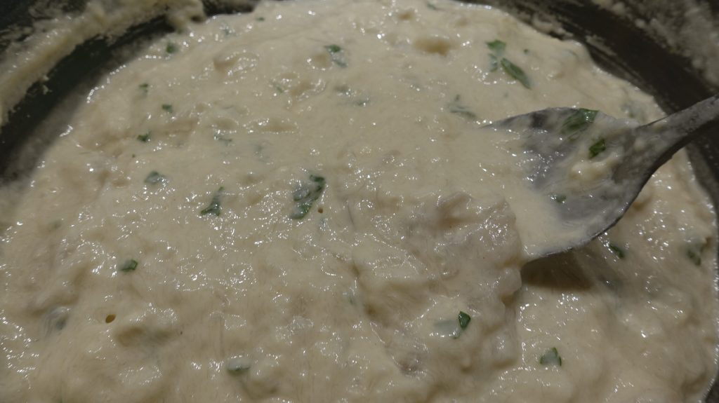 Hachez la chair de la morue, assaisonnez avec de l’ail et du persil haché. Mélangez la farine avec la levure, ajoutez l’eau et mélangez avec l’aide du fouet. Faites attention à ce qu’il n’y ait pas de grumeaux.