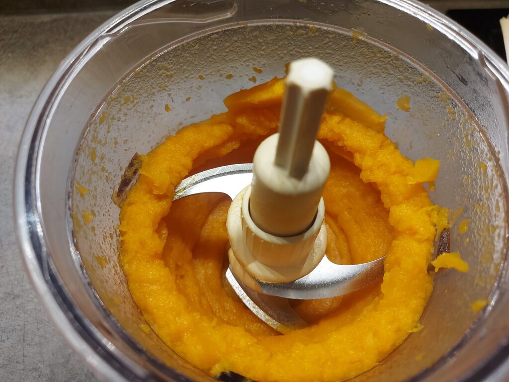 • Coupez la citrouille en dés après l’avoir épluchée et faites-la cuire au four à 200° pendant 15 minutes. Utilisez la delica, comme je l’ai fait, ces quelques minutes suffiront car il s’agit d’une citrouille très sèche et sucrée.
