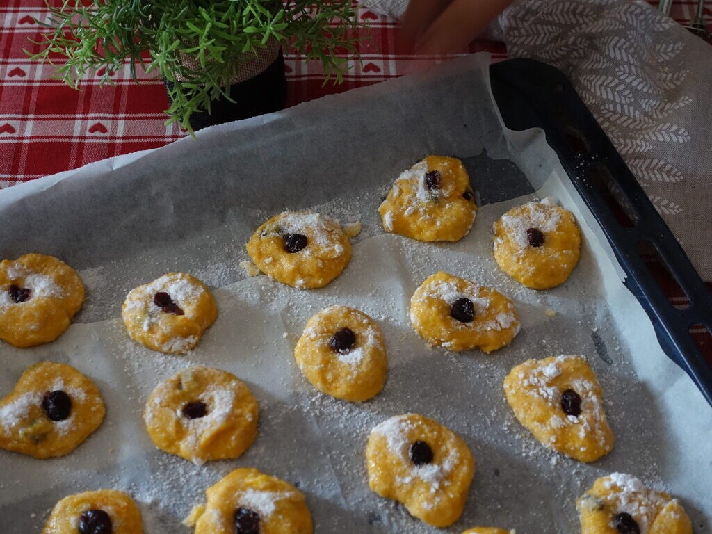 • Mélangez dans un bol avec la citrouille hachée, la farine, le sucre avec l’œuf, l’huile de graines et le bicarbonate avec les canneberges. Mélangez la préparation avec une spatule et avec le portionneur à glace, faites rouler une petite quantité d’abord dans le sucre glace puis dans celui en poudre, cela suffira pour préparer environ 18 biscuits.