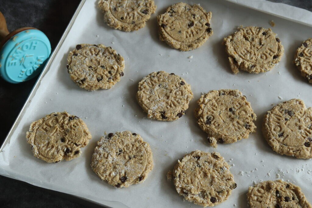 Pour préparer les biscuits, je me suis aidée d’un portionneur à glace, après avoir fait 15 boules, je les ai aplaties avec un emporte-pièce et disposées sur une plaque recouverte de papier sulfurisé.