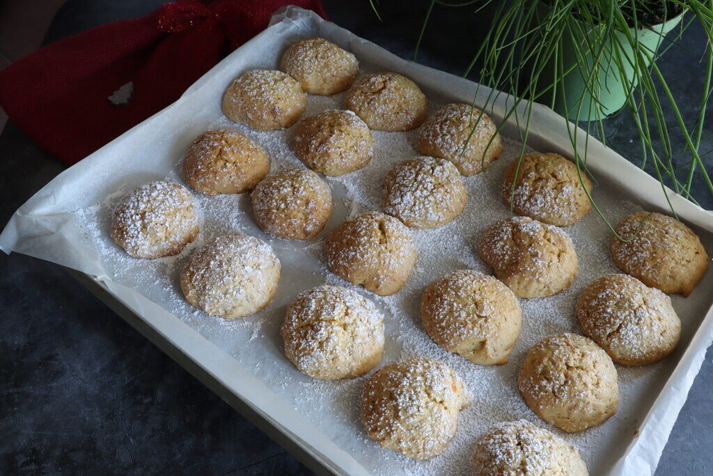 Utilisez 2 cuillères et formez des boules de 30/40 grammes chacune, posez-les sur la plaque de cuisson avec du papier sulfurisé. Saupoudrez-les de sucre glace.