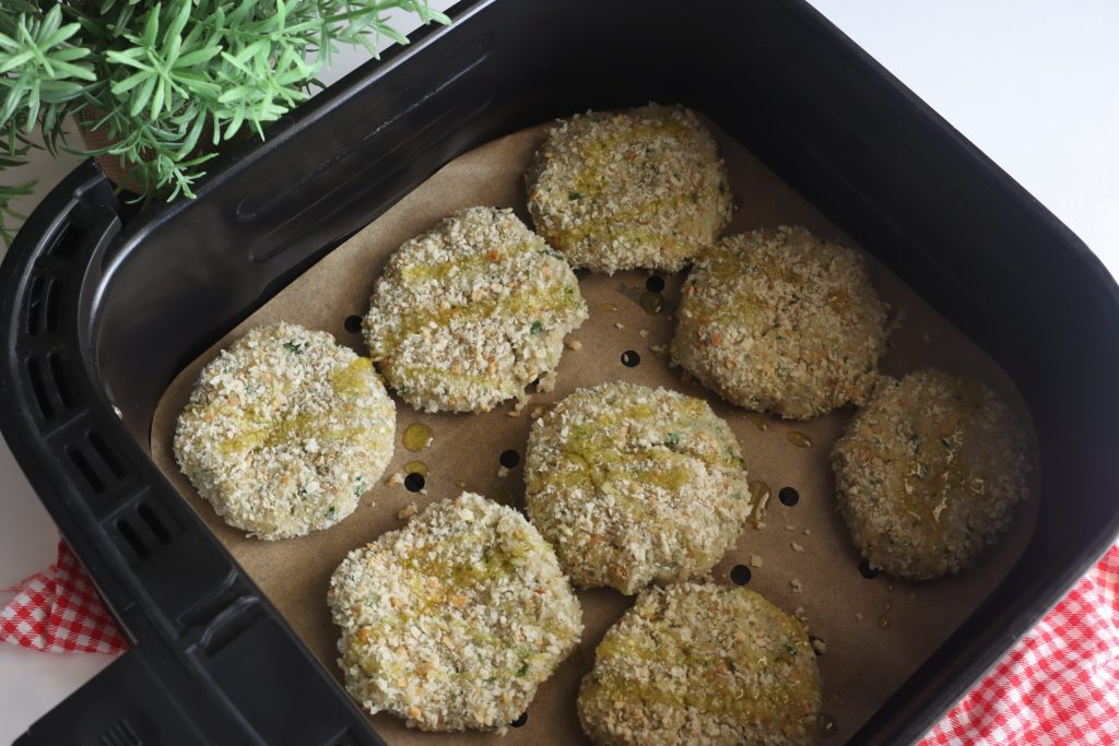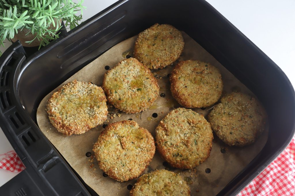 Si vous n’aimez pas particulièrement frire, mettez les boulettes d’aubergines avec du papier sulfurisé dans la friteuse à air, vaporisez un filet d’huile et faites cuire pendant 15 minutes à 180°.