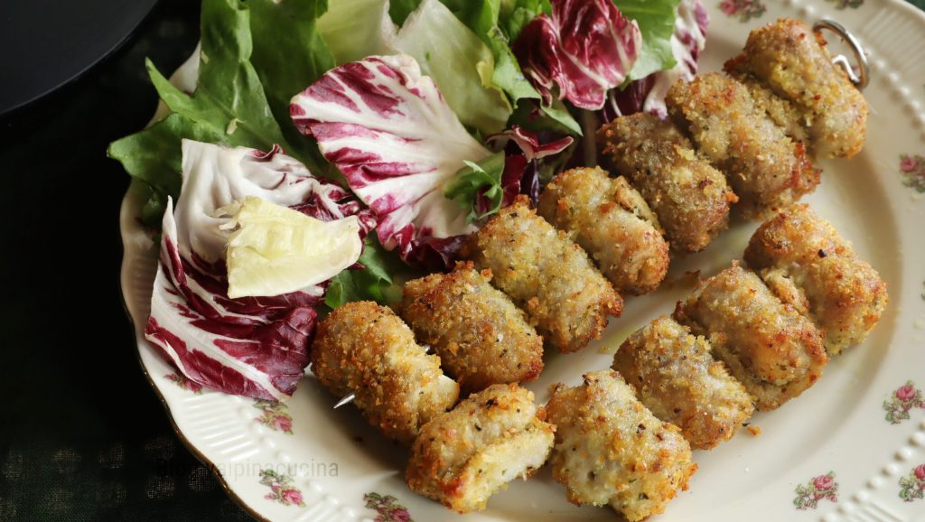 Brochettes messinaises qui en réalité seraient des roulades que nous appelons brochettes en Sicile, idéales pour le déjeuner dominical en famille. Non seulement en Sicile on prépare ces roulades, mais on les retrouve un peu sur toutes les tables italiennes et d’ailleurs, peut-être sous des noms différents. Par exemple, dans les Pouilles, elles sont appelées bombettes, mais si nous voulons elles sont très similaires. Celles que j’ai préparées sont très simples, avec de la chapelure assaisonnée et au cœur de la brochette seulement un petit carré de fromage qui en Sicile est le caciocavallo ragusano, mais moi j’ai mis un morceau de provola. J’ai utilisé des tranches de veau appartenant à la catégorie des viandes blanches, mais on peut sûrement utiliser aussi du bœuf ou même du poulet et pas seulement.