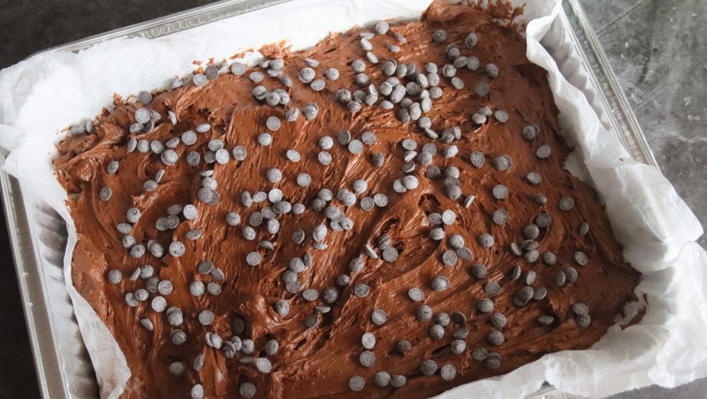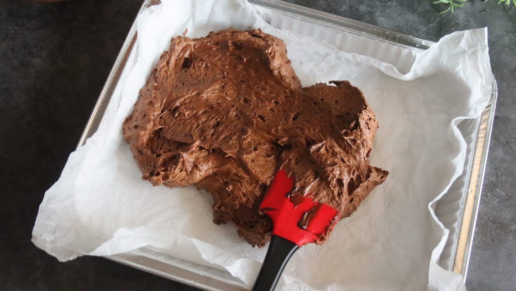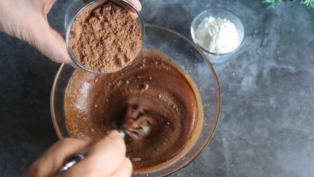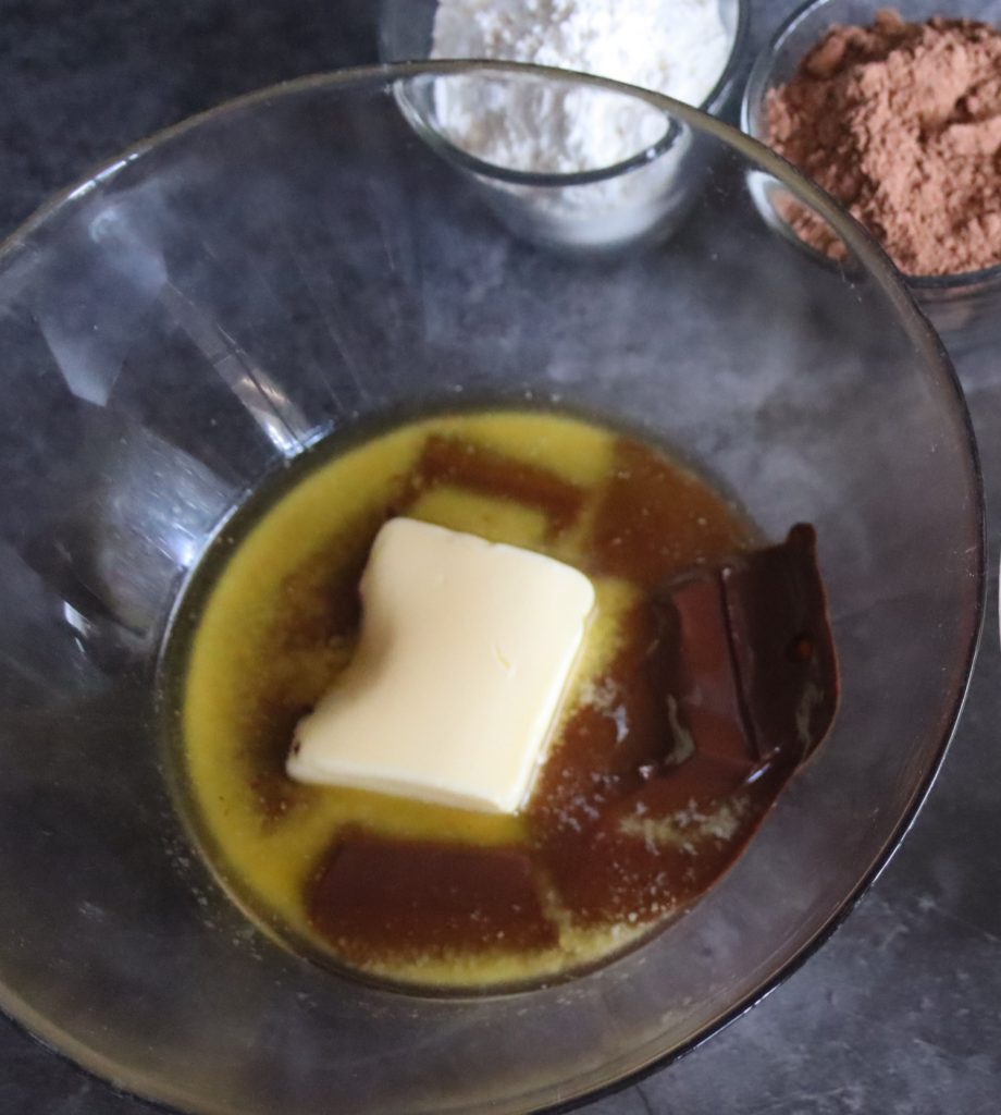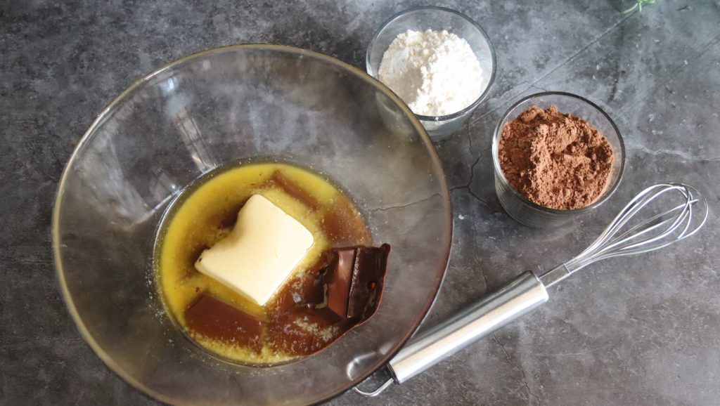 Faites fondre le chocolat noir et le beurre, mettez le bol avec le chocolat au micro-ondes pendant 3 minutes puis une autre minute en ajoutant également le beurre. Une autre méthode est de faire fondre le chocolat et le beurre au bain-marie. Laissez tiédir et incorporez les œufs avec le sucre, le cacao amer avec la farine. Tapissez un moule carré de papier sulfurisé mouillé et essoré (n’ayant pas de moule carré, j’ai utilisé un moule en aluminium) ou simplement vaporisez un spray de démoulage et saupoudrez de cacao le moule. Versez la préparation et lissez-la avec la spatule, faites cuire au four statique à 180° pendant 25 minutes.