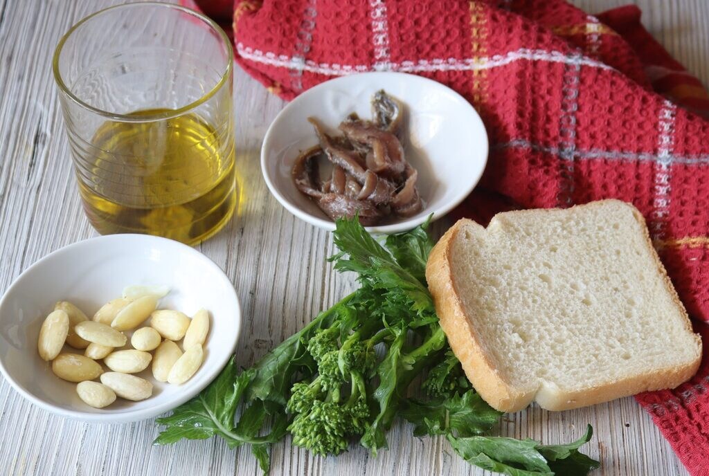 Dans le hachoir, versez l’huile, les anchois, les amandes, l’ail, le persil et le pain de mie sans la croûte. Hachez pendant quelques secondes et ajoutez encore de l’huile si nécessaire.