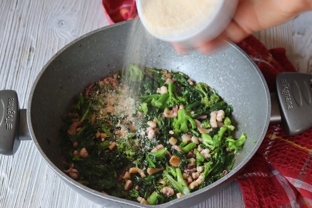 Hachez grossièrement les friarielli et ajoutez-les au hachis doré.