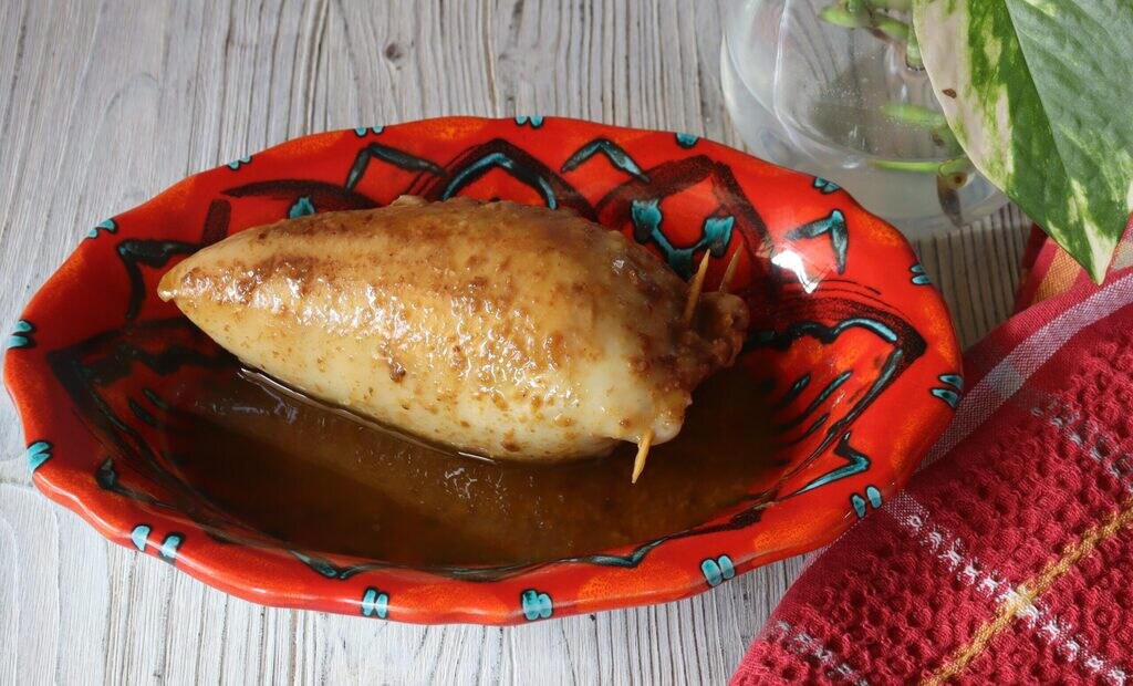 Remplissez le calamar avec le mélange et fermez-le à l’extrémité avec deux cure-dents. Dans la même casserole, versez encore de l’huile, faites rissoler le calamar farci, arrosez de vin blanc et laissez cuire 30 minutes à couvert en le retournant souvent.