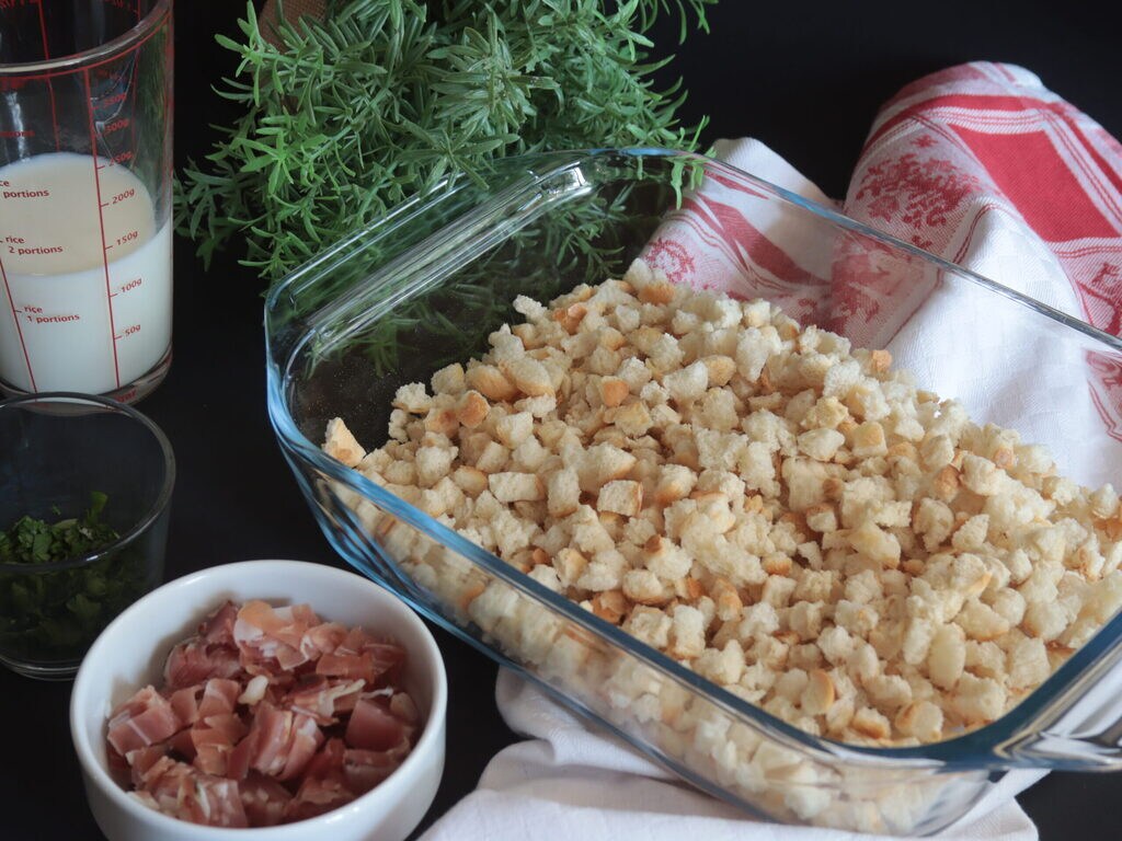 • Dans le bol, mettez le pain rassis coupé en petits dés, arrosez avec le lait et ajoutez la ciboulette.