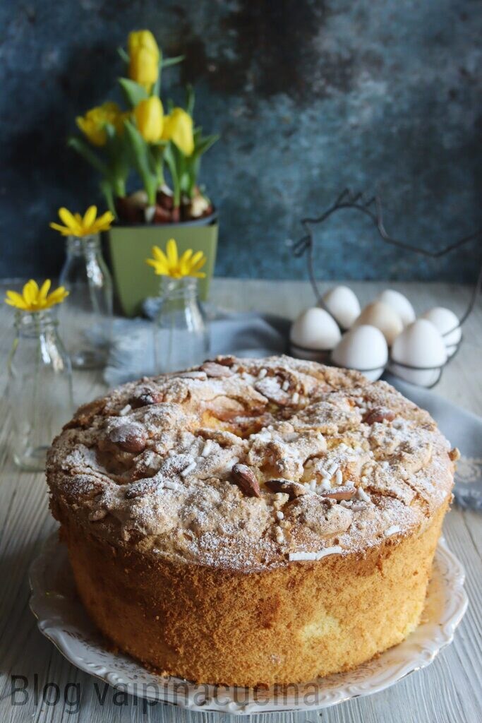 Chiffon cake de Pâques, mon gâteau à thème printanier et festif. Inspiré de la colombe de Pâques et recréant le même glaçage avec beaucoup d’amandes auxquelles j’ai évidemment ajouté, en tant que Sicilienne, des pistaches. Bien sûr, vous pouvez également ajouter des noisettes ou des noix, mais si vous préférez uniquement des amandes, cela ira très bien. La chiffon cake est un gâteau américain apprécié de tous, non seulement pour sa saveur délicate, mais aussi pour sa légèreté un peu comme de la soie, d’où son nom chiffon. J’adore ce gâteau, pouvais-je ne pas en faire un à thème pascal ? Bien sûr que non, et le voici, mon chiffon cake de Pâques, accompagné de la recette, je vous rappelle quelques plats typiques pour cette période.