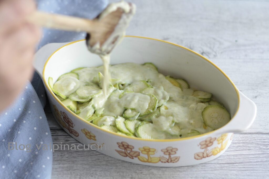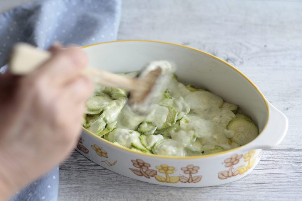 Mélangez la béchamel sur les courgettes crues et coupées en fines tranches.