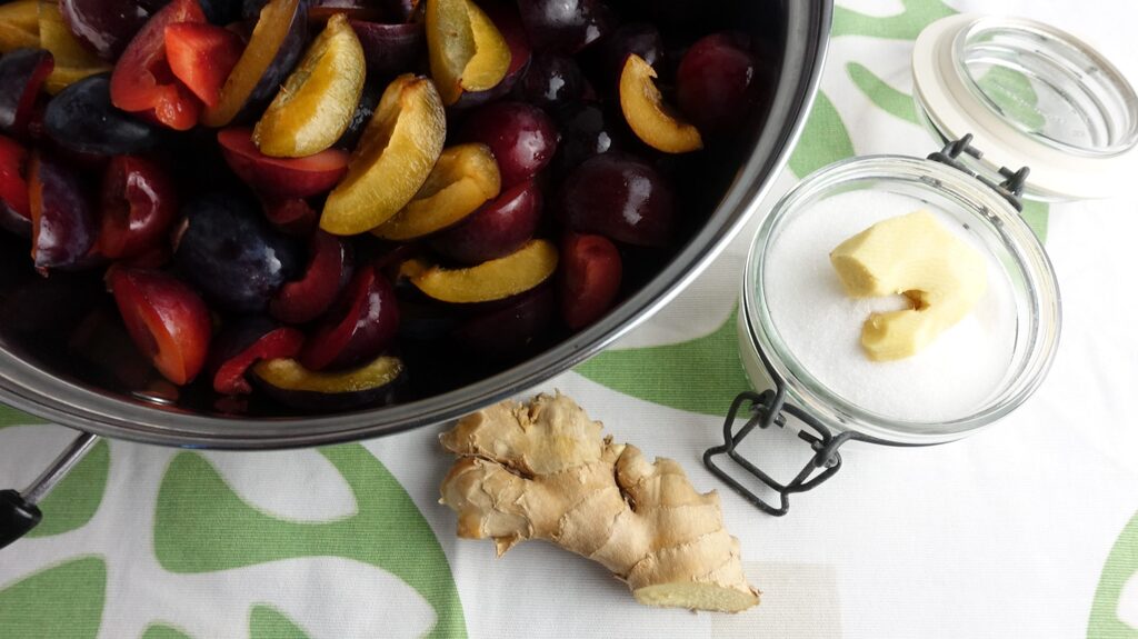 • Pour faire une bonne confiture, il faut de bons fruits, n’utilisez pas des fruits qui vous restent mais achetez-les exprès. Pour la confiture de prunes et gingembre, les prunes doivent être mûres mais pas trop molles. Lavez, séchez, coupez en deux et dénoyautez les fruits, la cuisson doit durer 20 minutes pendant lesquelles il faut remuer souvent.