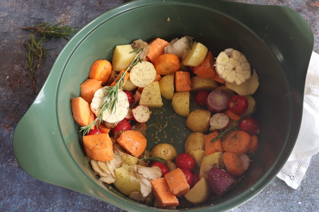 Je lave les pommes de terre et je les coupe en gros morceaux; certaines je les épluche, d’autres non. Après avoir pelé les carottes, je les coupe en rondelles. Les radis, je les ajoute entiers et certains coupés en deux. Indispensable, une tête d’ail entière coupée en deux dans le sens de la largeur. L’oignon, je le coupe également en gros morceaux, tout comme la patate douce, après l’avoir épluchée. Le topinambour, étant congelé et déjà coupé en morceaux, je l’ai utilisé pour l’intérieur du coq, tout comme une partie du romarin et de l’ail.