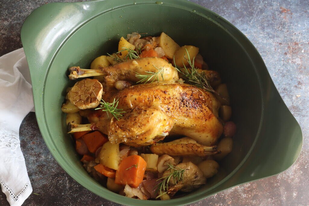 Coq rôti avec Cocotte Incroyable. Depuis que j’ai cette marmite magique, il n’y a pas un plat que je ne veuille y préparer. Bien sûr, faire cuire un coq entier, fermier et géant, si on veut, avec tous les légumes, c’est un défi. Mais voulez-vous savoir comment cela s’est passé ? Suivez la recette étape par étape ici et même votre coq rôti sera succulent, tout comme la poitrine sera très tendre. Dernièrement, pour un choix personnel, j’ai opté pour une cuisine végétale par goût : j’adore les légumes. Une petite partie de mon cœur, cependant, grâce à des souvenirs d’enfance, me pousse souvent à cuisiner le coq ou le poulet, selon le cas. Savez-vous, d’ailleurs, la différence entre un poulet et un coq ? Le coq est le mâle adulte de l’espèce, tandis que le poulet désigne un animal jeune, qu’il s’agisse d’une poule ou d’un coq. Je vous disais que, quand j’étais petite, le week-end était toujours une fête car nous allions chez les grands-parents et y restions aussi le dimanche. Le déjeuner était le coq rôti avec des pommes de terre. Aujourd’hui, j’ai pensé préparer le coq rôti dans ma casserole incroyable super spacieuse et, donc, je le cuisine entier avec légumes et tubercules, ce que j’ai à la maison et dans le congélateur, comme les topinambours.