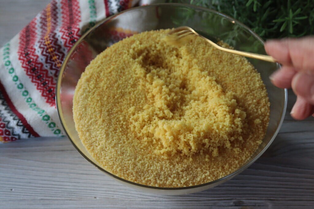 Laissez reposer le couscous pendant 10 minutes, couvrez le bol avec une assiette.