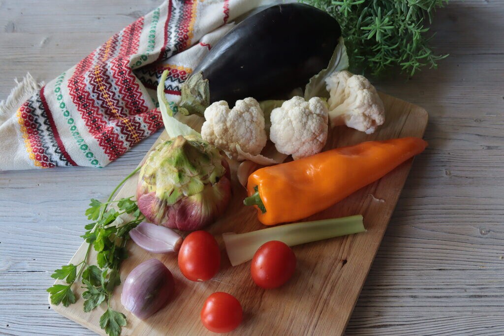 Couscous avec des légumes de saison comme le chou-fleur et les artichauts, mais aussi des poivrons et des aubergines qui ne sont pas du tout de saison ! Ils me plaisaient, ils allaient bien ensemble et j’ai fait cette entorse à mes règles, celle de ne pas acheter d’aliments hors saison. J’adore préparer le couscous, en tant que Sicilienne, je dois admettre que je l’utilise plus que le riz pour les salades d’été et en hiver, j’aime le préparer avec de la viande et bien sûr plein de légumes.