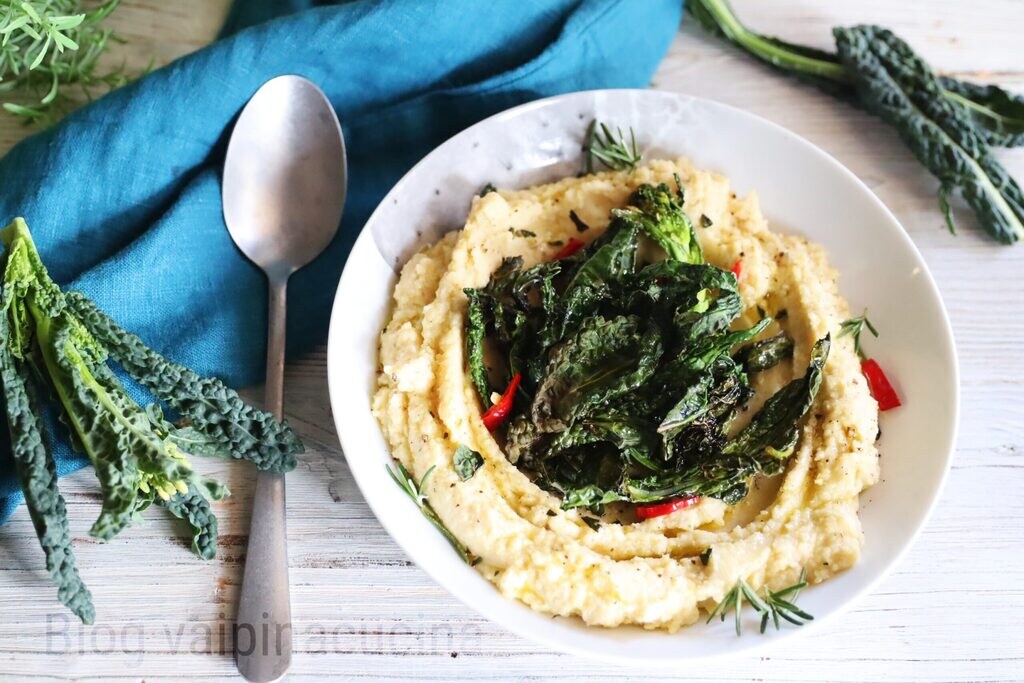 Mixez les pois chiches cuits avec le sel et l’huile d’olive extra vierge, le poivre et le romarin, et l’eau bien sûr. Nettoyez le chou noir et utilisez seulement les feuilles (le reste mettez-le dans le minestrone en morceaux), faites-le cuire dans la friteuse à air à 200° pendant 10 minutes avec du sel et une giclée d’huile d’olive extra vierge. Assemblez le plat avec la crème de pois chiches et par-dessus le chou croquant. Ajoutez un filet d’huile et si vous le souhaitez, un peu de piment fort.