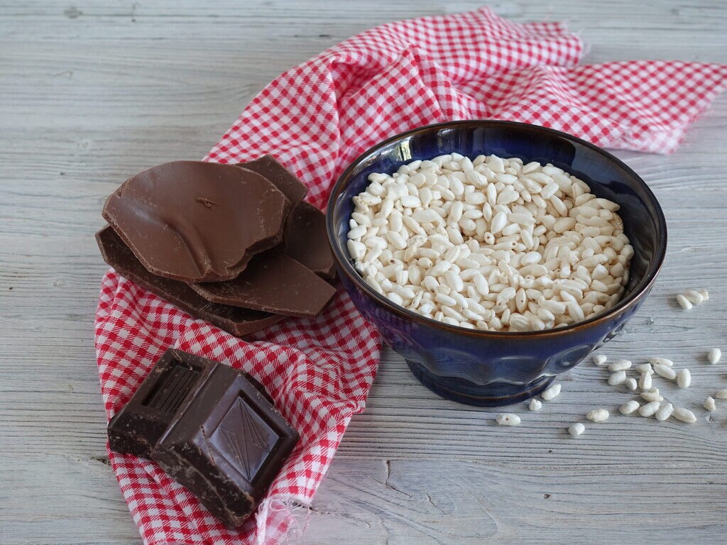 Mettez une casserole d’eau à bouillir et au-dessus dans un bol, le chocolat noir coupé en éclats pour le faire fondre au bain-marie. Ajoutez le riz soufflé sur le chocolat désormais mou et avec une louche en bois, mélangez les deux ingrédients.