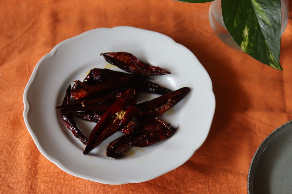 Pour un goût adulte, dans une poêle avec un filet d’huile, j’ai frit des poivrons crus pour accompagner les croquettes,