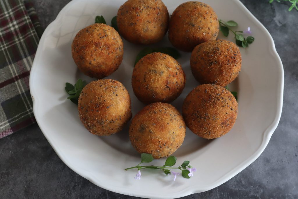 Considérant que j’ai utilisé uniquement des ingrédients cuits pour assembler les croquettes, une longue friture n’est pas nécessaire : il suffira de les dorer légèrement.